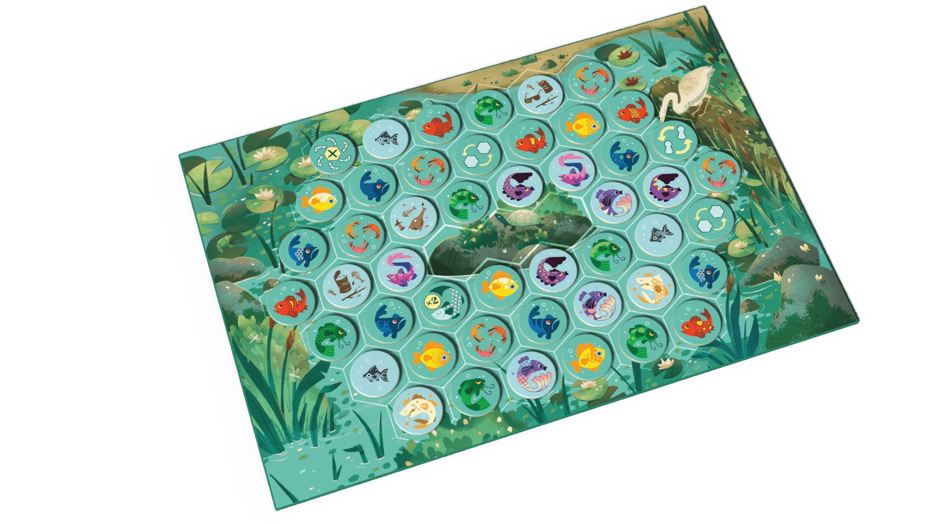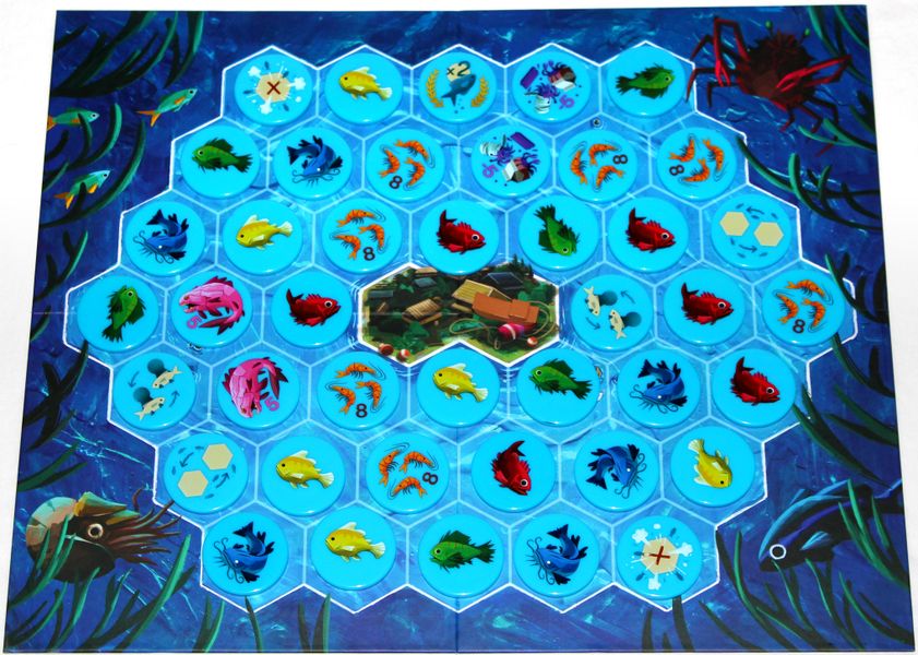 Au verso du plateau d’origine se trouve un second plus grand, permettant des parties plus longues, et jusqu’à 5 joueurs. Cela nous a amené à imaginer de nouveaux types de poissons, comme le Kingfish (qui n’a pas de nom par chez nous car il n’existe pas en Europe) donnant une victoire immédiate au joueur qui en attrape, selon le nombre de joueurs, 2 ou 3, ou le Lunker, un gros poisson qui rapporte 5 points uniquement au dernier joueur à en avoir pris un. Il devient aussi possible de varier les configurations de jeu, en ne plaçant pas toujours dans le lac – car c’est maintenant un lac – les mêmes poissons.