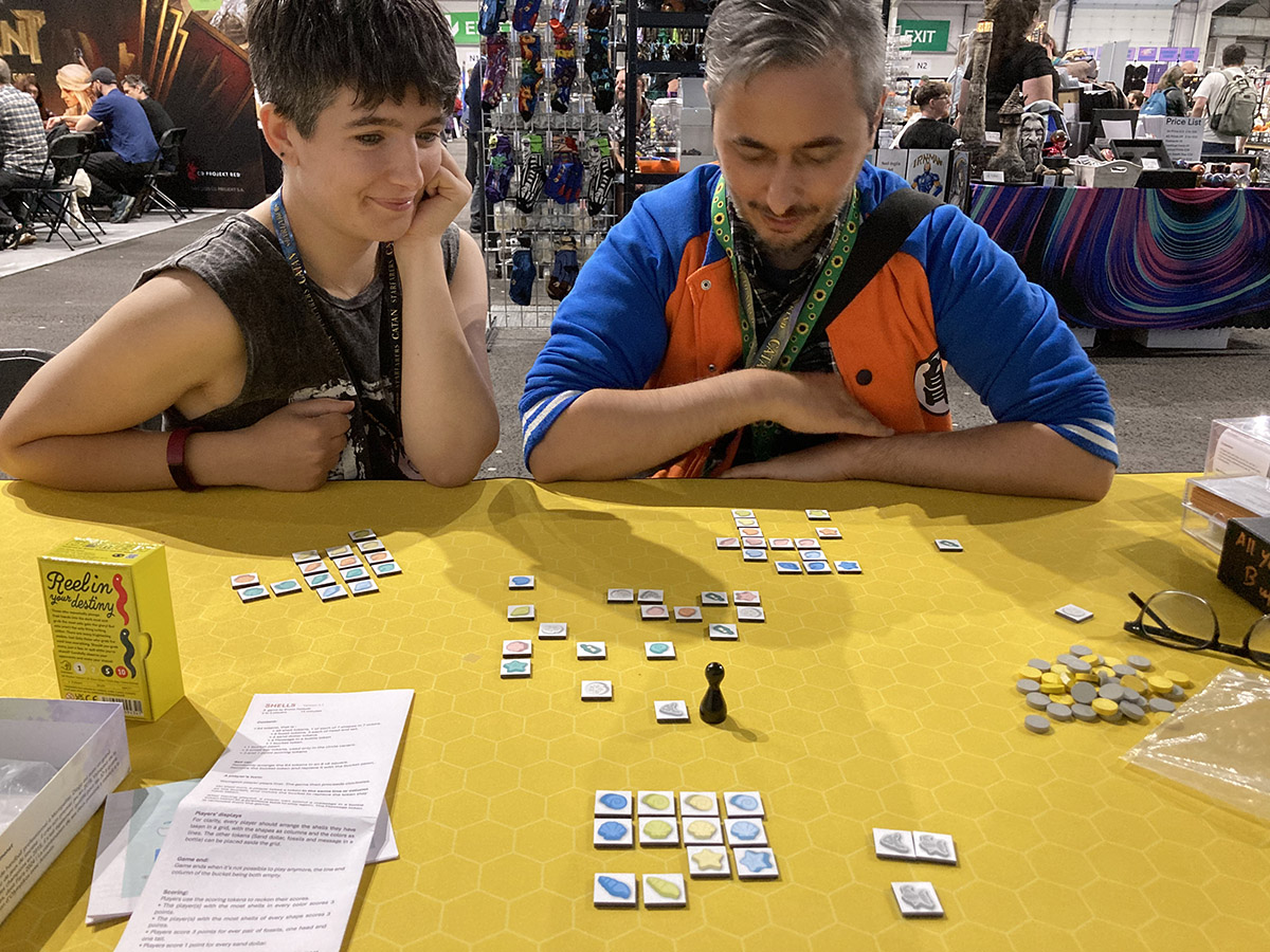 Liesbeth à Etourvy, jouant à un prototype avec Krzysz, un autre de ces gens que l’on croise sur tous les salons sans jamais savoir exactement ce qu’ils font.