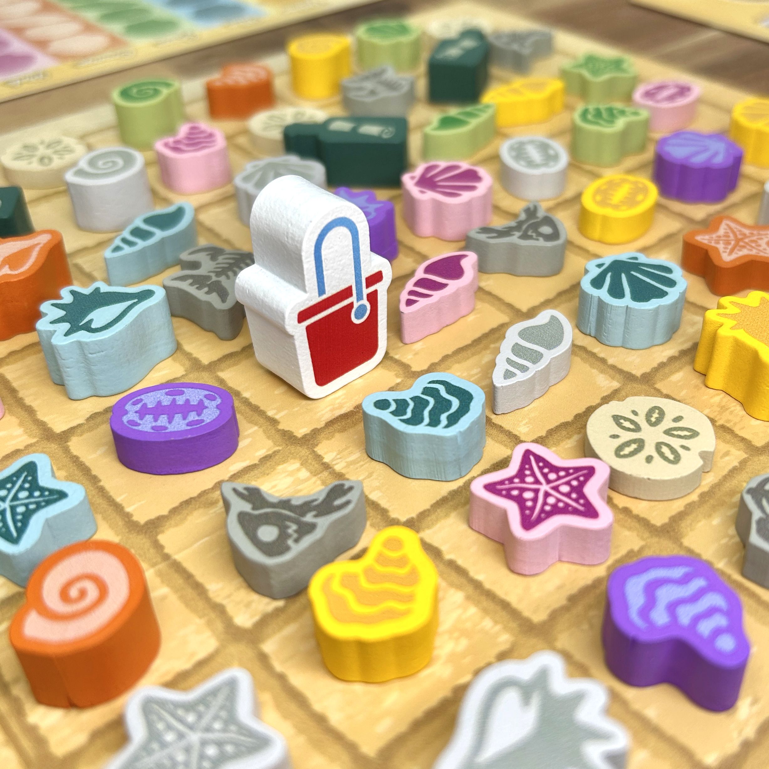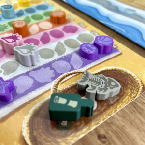 The development then went fast. Josh and Helaina added a few new elements to the games. First, there were special tokens, fossils and sand dollars (a great English name I didn’t know). Then there were cards working like two “secret tokens” for the players.