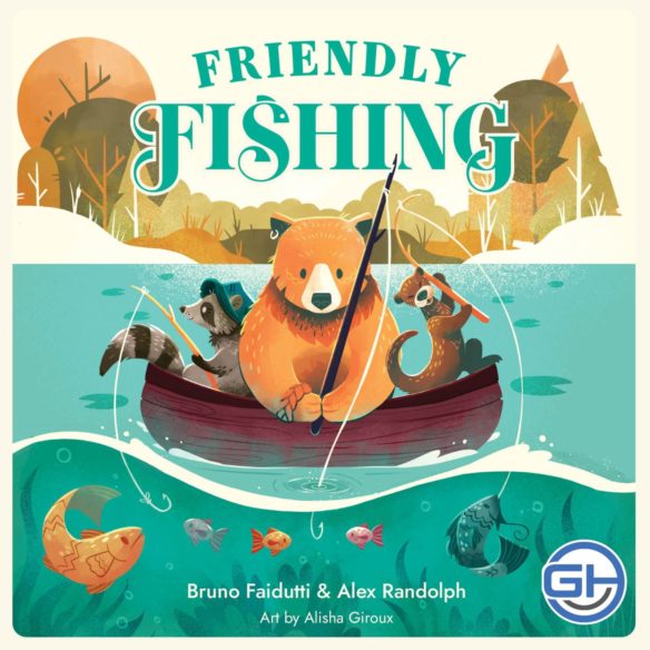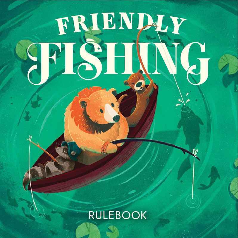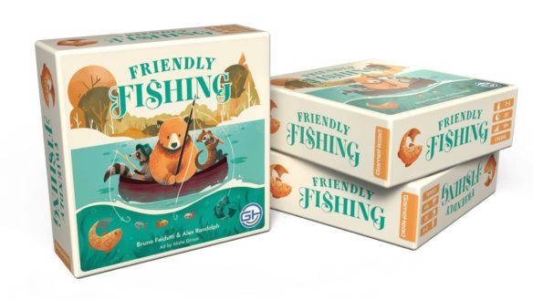 Le thème de la pêche, imaginé par l’éditeur précédent, fonctionne parfaitement, et il a donc été conservé, mais on pêche désormais dans un lac, et les variétés de poisson sont celles que l’on rencontre dans les d’Amérique du Nord. Le plateau de jeu en tissu imprimé recto-verso est absolument splendide. Les illustrations d’Alisha Giroux pour Friendly Fishing sont aussi charmantes et colorées que celles de Kwanchai Moriya pour Tonari. Le chalutier japonais est devenu une barque, et les pêcheurs des animaux anthropomorphes, une mode très présente dans les jeux de société, que j’ai cherché à expliquer il y a quelques temps dans un long article. Bref, Friendly Fishing est superbement édité, et je lui souhaite une vie plus longue qu’à Tonari.