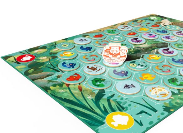 The fishing storyline imagined by the first publisher worked perfectly, and we kept it for this edition. The setting is now a forest lake, and the fishes are more or less those one can find in North America. The cloth printed board is really nice, and the art by Alisha Giroux is as cute and colorful as that by Kwanchai Moriya for the first edition. The Japanese trawler has become a cute small wooden boat, and the fishermen anthropomorphic animals – a recent trend in boardgames I recently tried to explain in a long article.