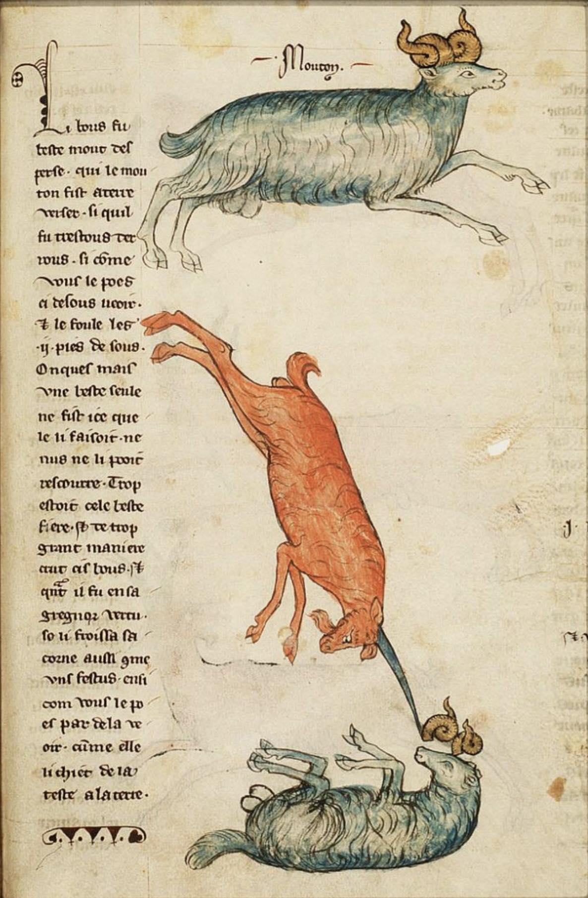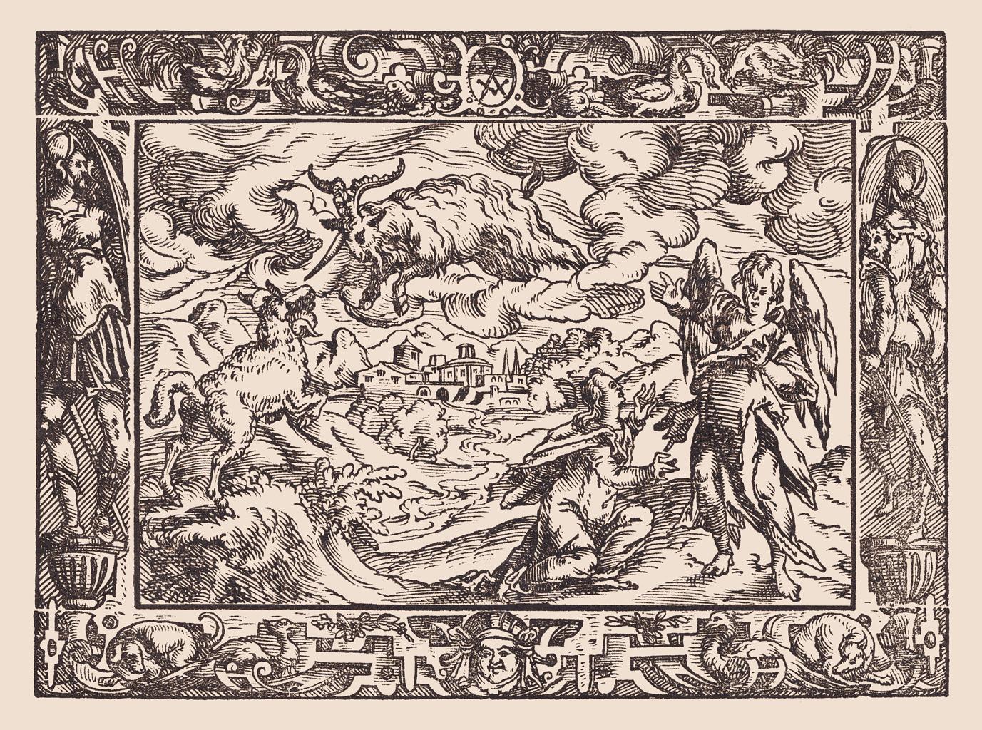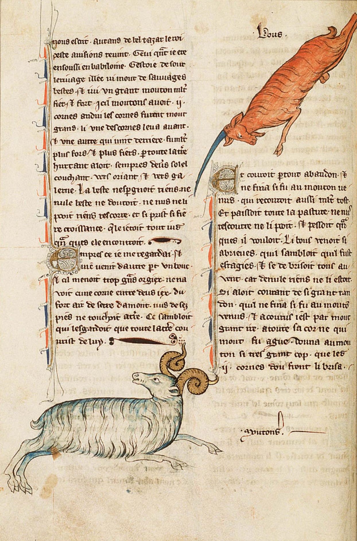 Face au bélier dont une corne est plus longue que l’autre accourt donc, ou plutôt vole, un bouc « qui parcoure la terre sans la toucher, et a une longue corne entre les deux yeux ». L’animal a certes une corne mais il reste un bouc plus qu’une licorne. Aucun des traducteurs de la Bible ne l’a jamais appelé unicornis ou monoceros, mais les enlumineurs le dessinèrent parfois sur le modèle de la licorne, ce qui était d’autant plus facile que cette dernière avait, à la fin du Moyen Âge, une barbichette et des sabots fendus très caprins[1].