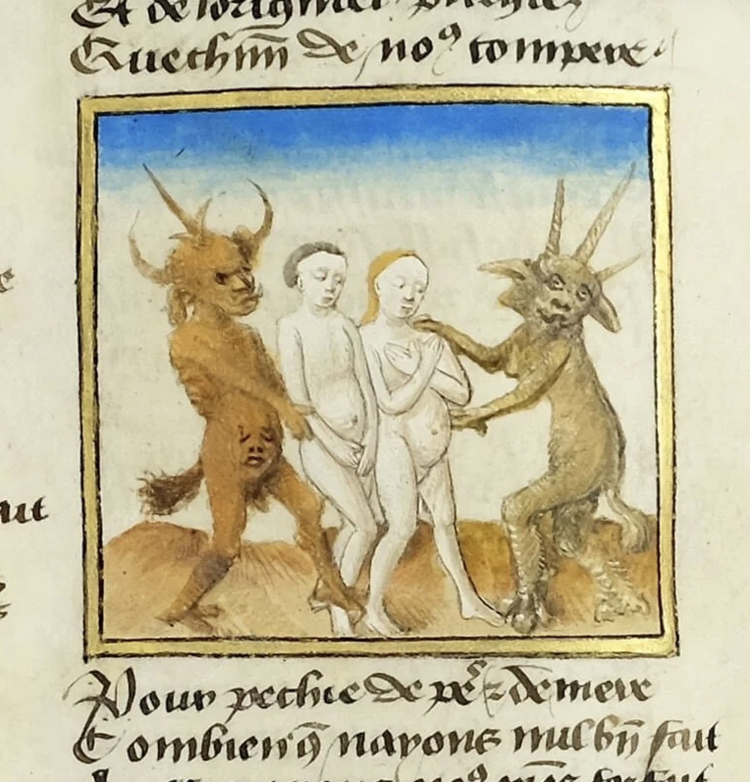 L’un de ces démons a des sabots fendus, l’autre des serres, mais tous deux ont une corne spiralée. Les Mérancolies de Jehan Dupin sur les conditions de ce monde, XVe siècle.