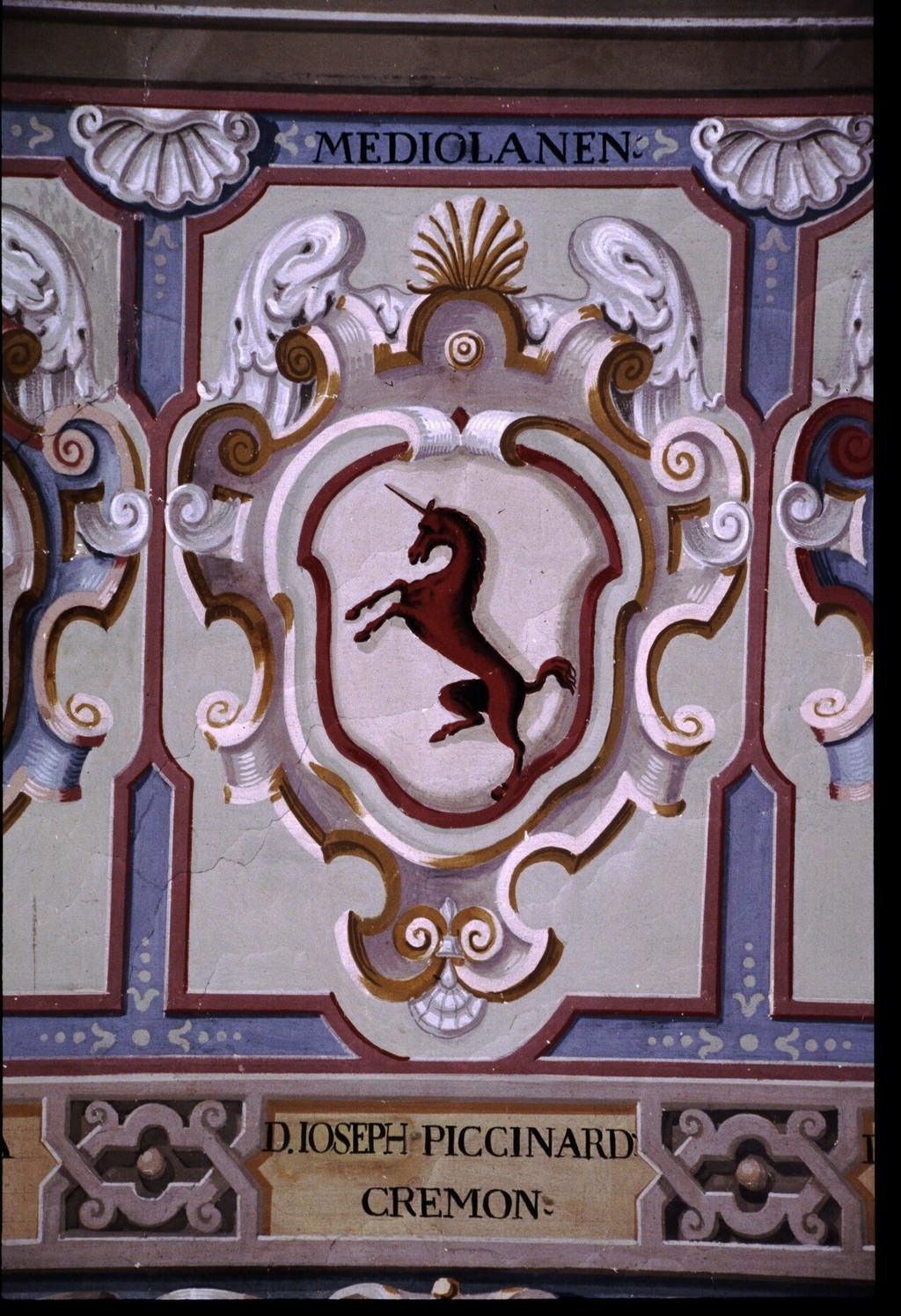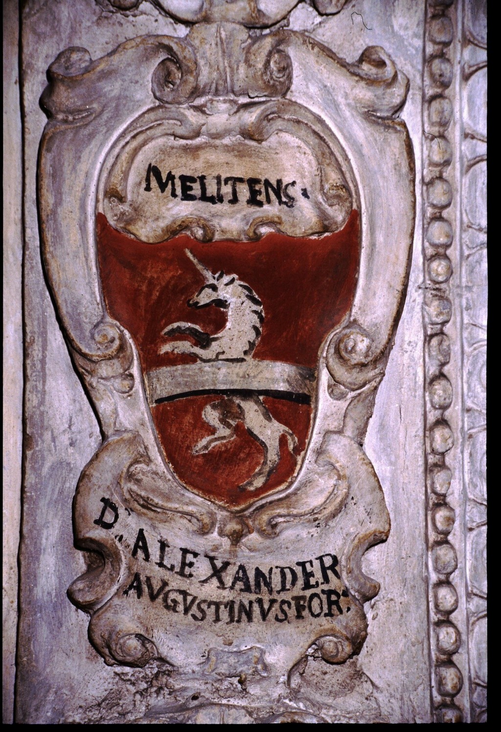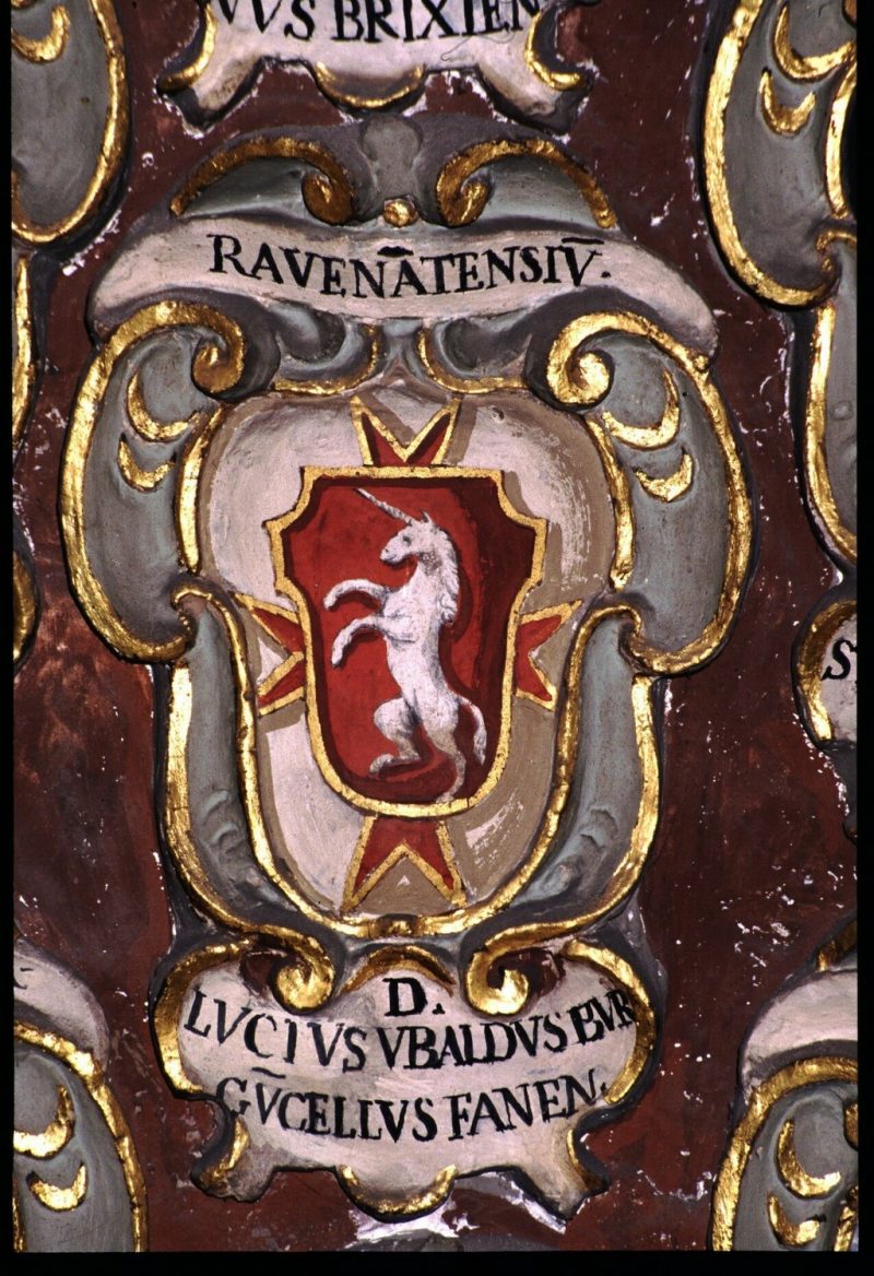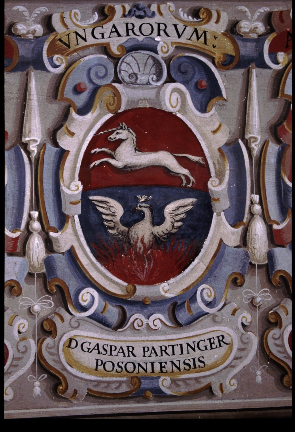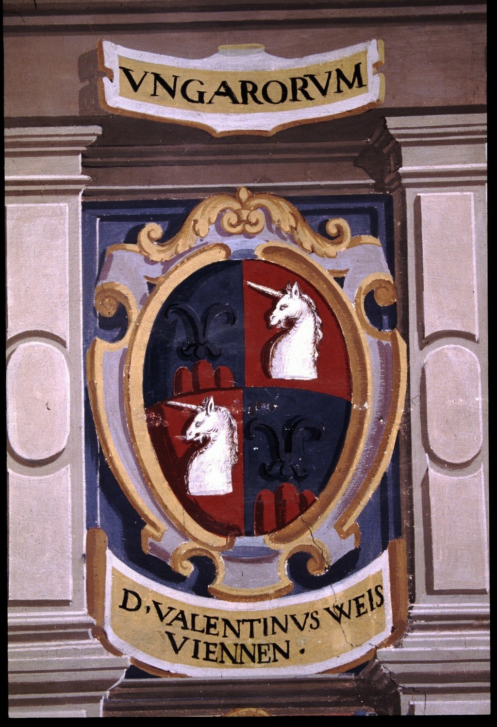 L’université de Bologne était, depuis le XIIe siècle, l’une des plus renommées d’Europe. Au XVIe siècle fut construit l’archigymnase – archiginnasio – qui resta jusqu’en 1803 le siège des facultés de droit, de médecine, de mathématiques et de sciences naturelles. Les murs en sont abondamment décors par les plus de six-mille blasons des maîtres d’étude et des plus brillants étudiants qui s’y sont succédé. L’université de Bologne attirait bien sûr de nombreux étudiants du Nord de Italie, de Suisse, d’Autriche et de Hongrie, et plusieurs dizaines de licornes rampent et passent sur les murs de l’archigymnase.
