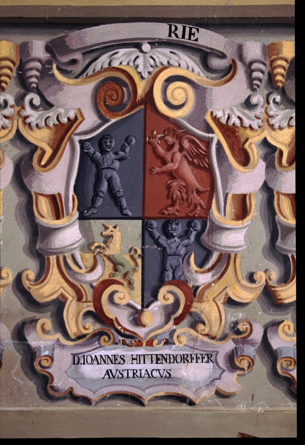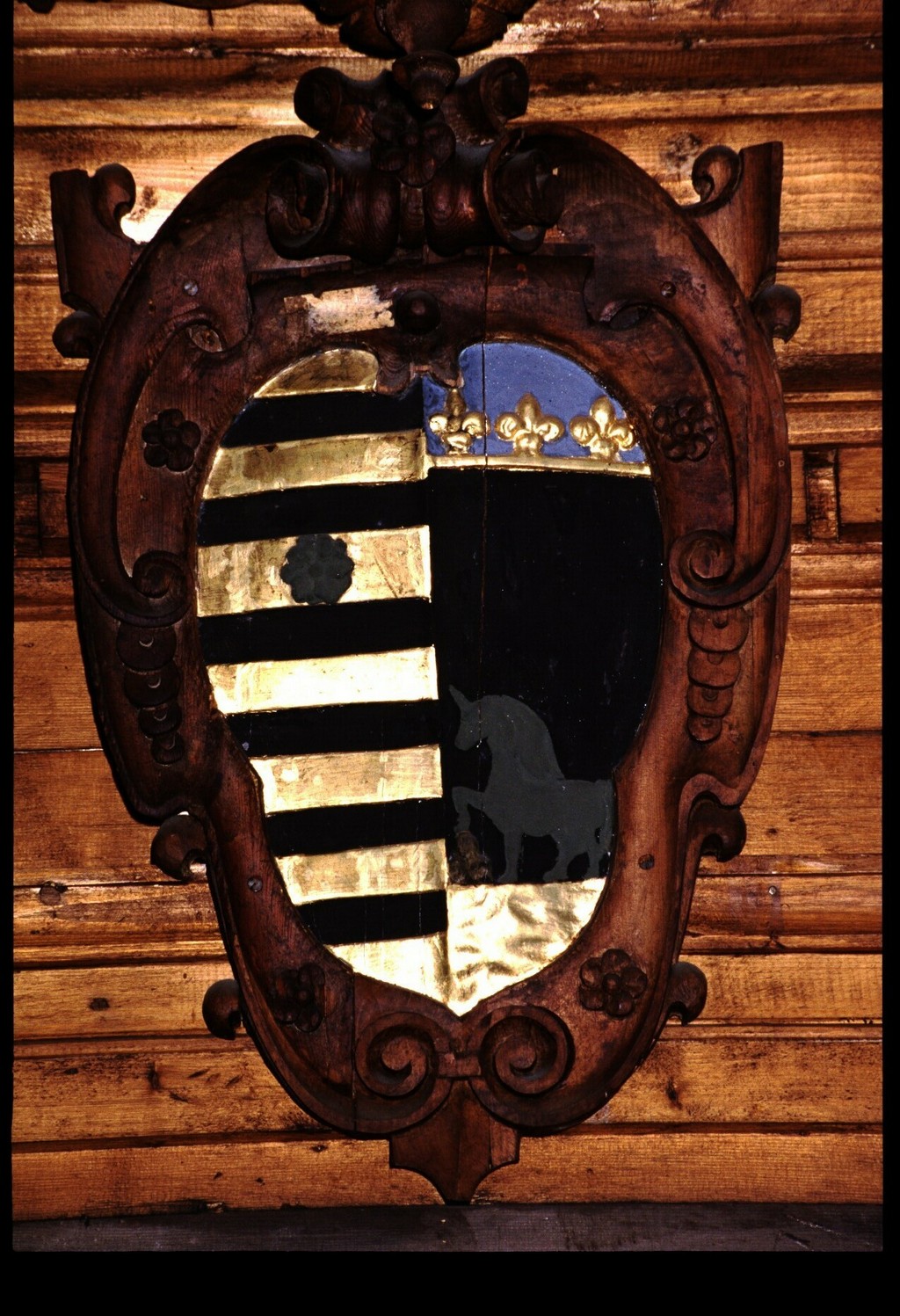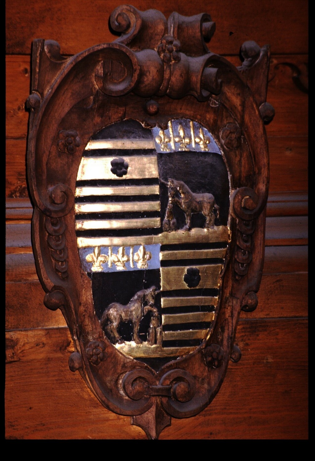 Le cerf de sable encorné de gueules de l’écu de Hirschberg est parfois, comme ici, dessiné unicorne. Il est cependant le plus souvent classiquement armé de deux bois.