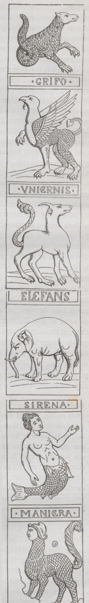 De bestes crueuses et fieres, Dragons, serpens, escorpions, De toutes générations, Buglos, chameus, tygres, panthères, De tous genres, pères et mères, Olifans, liepars et liepardes, Ourses, lions, renars et renardes, Loiemiers, grans alans d’Espaingne, Et pluseurs matins d’Alemagne, Castors, aspis et unicornes, Et une autre beste a deus cornes, Trop diverse et trop périlleuse, Trop estrange et trop venimeuse… Son nom ne saroie nommer. Je croy qu’elle vint d’outre mer, Si vorroie bien qu’elle y fust Et que retourner n’en peust.