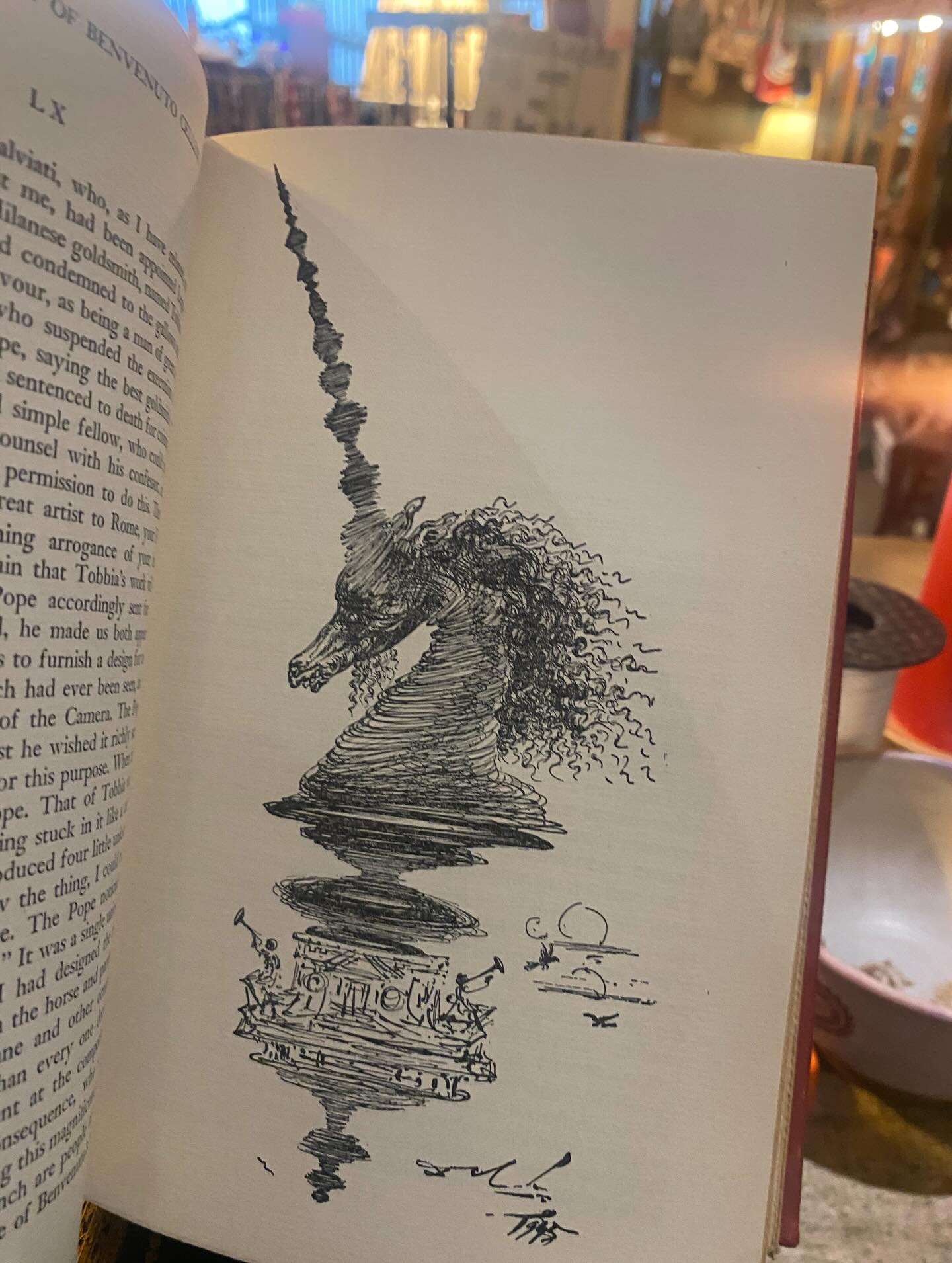 Si c’est d’elle qu’il s’agit, j’ignore ce que ce socle est devenu. On n’en sait moins encore sur le sort du socle réalisé par Cellini, pour lequel on a juste…. Un dessin de Salvador Dali illustrant une édition de 1946 de la foisonnante autobiographie du sculpteur et joailler italien.