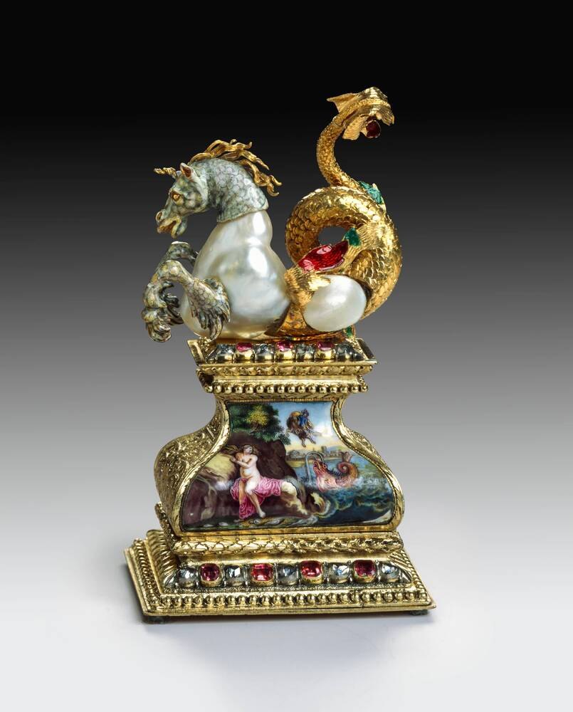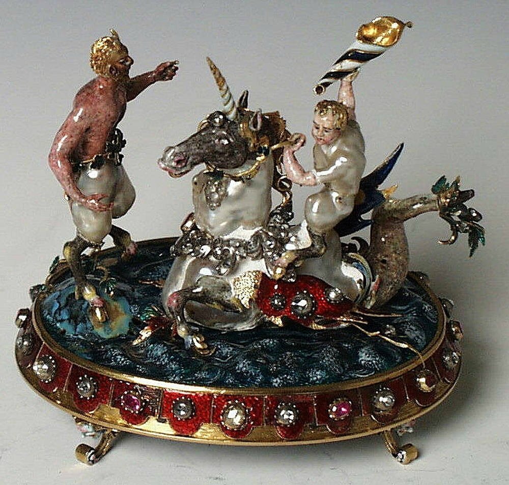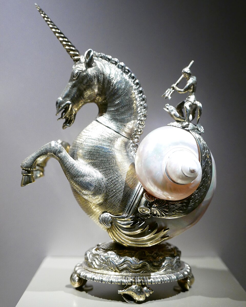 La Voûte Verte, à Dresde, est un musée abritant la plus grande collection au monde de trésors baroques, bijoux, sculptures, figurines et pièces d’orfèvrerie où le travail de l’artiste vient mettre en valeur des merveilles de la nature. L’or, l’argent et l’émail y côtoient le jaspe, l’émeraude, les perles, le corail et les coquillages. Même si l’on y croise un étonnant Actaeon changé par Diane en cerf unicorne, ou plutôt unibois, c’est moins dans les scènes de chasse en forêt que dans les représentations marines qu’il faut chercher la licorne. On doit par exemple à l’orfèvre allemand Elias Geyer (1560-1634) plusieurs sculptures de créatures semblant sortir de coquilles de nautiles, parmi lesquelles quelques licornes. Ce ne sont pas des narvals, encore mal connus à cette époque, ce ne sont pas non plus des licornes. Ce sont les hippocampes de la mythologie grecque qui, parce qu’elle leur donne plus fière allure, gagnent alors une corne et deviennent des sortes de licornes de mer, ce qu’ils n’avaient jamais été dans les représentations antiques.