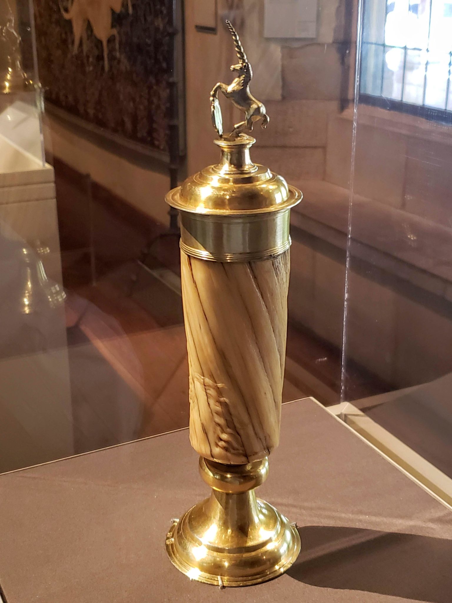 Corne de licorne sur un socle du XVIIe siècle. Musée médiéval de Bologne.