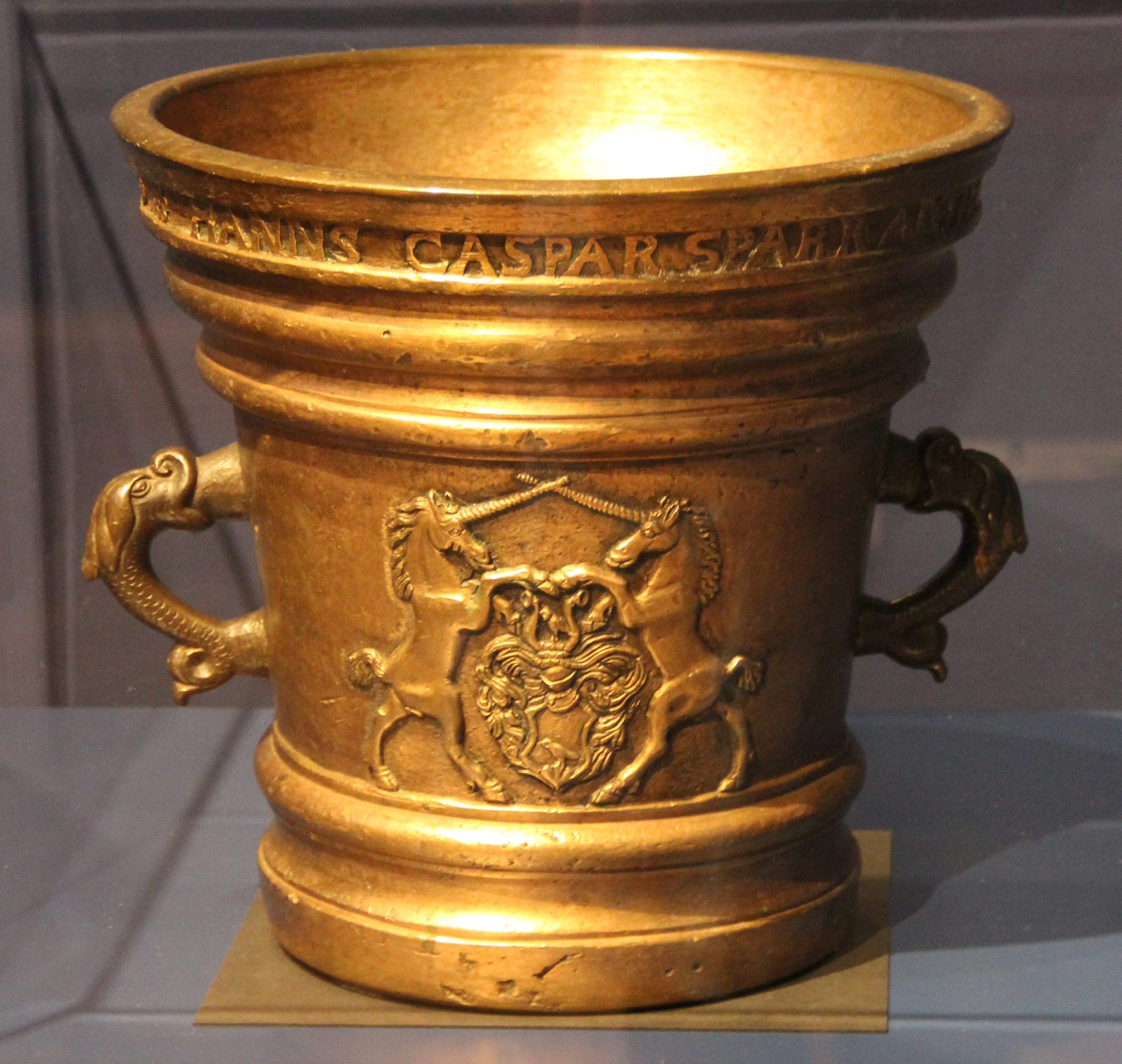 Aux XVIIe et XVIIIe siècle, ces carreaux de faïence servaient de support pour réduire les médecines en poudre. Ceux-ci sont aux armes de la société des apothicaires de Londres, où figurent à la fois deux licornes et un rhinocéros, manière de ne pas vraiment prendre parti. La devise opiferque per orbem dicor signifie dans le monde entier, on dit que j’apporte de l’aide.
