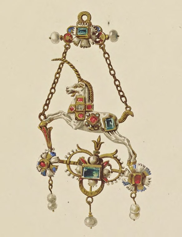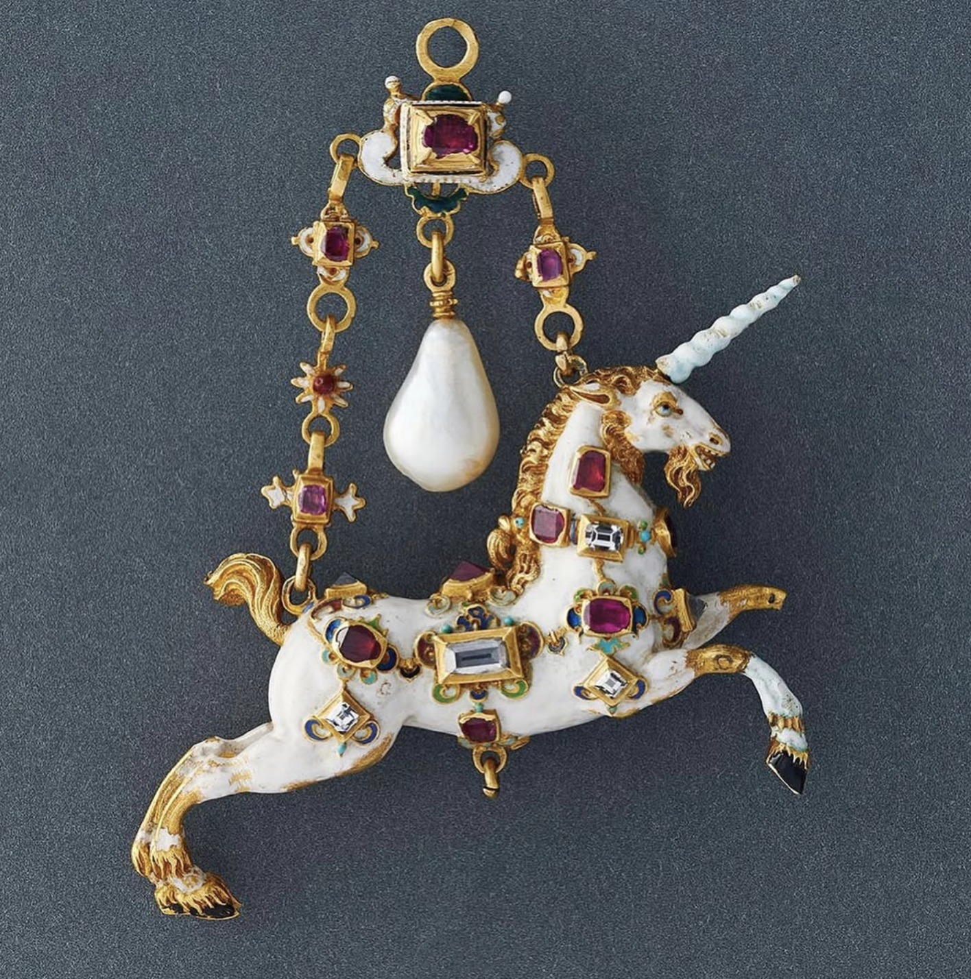 Les orfèvres de la Renaissance ont à l’occasion dessiné, sculpté, taillé des licornes. Les plus petites sont sur des bagues, comme sur une belle bague en or émaillé ou une licorne blanche et une dame en robe bleue encadrent un cœur rouge et un petit coffret. D’autres, en ivoire ou en émail ornent des colliers et pendentifs – mais il faut être prudent, les plus beaux de ces bijoux sont souvent des faux ou des copies du XIXe siècle. C’est par exemple le cas de celui qui se trouve à New York, au Metropolitan Museum, et qui représente un triton chevauchant une licorne matrine.