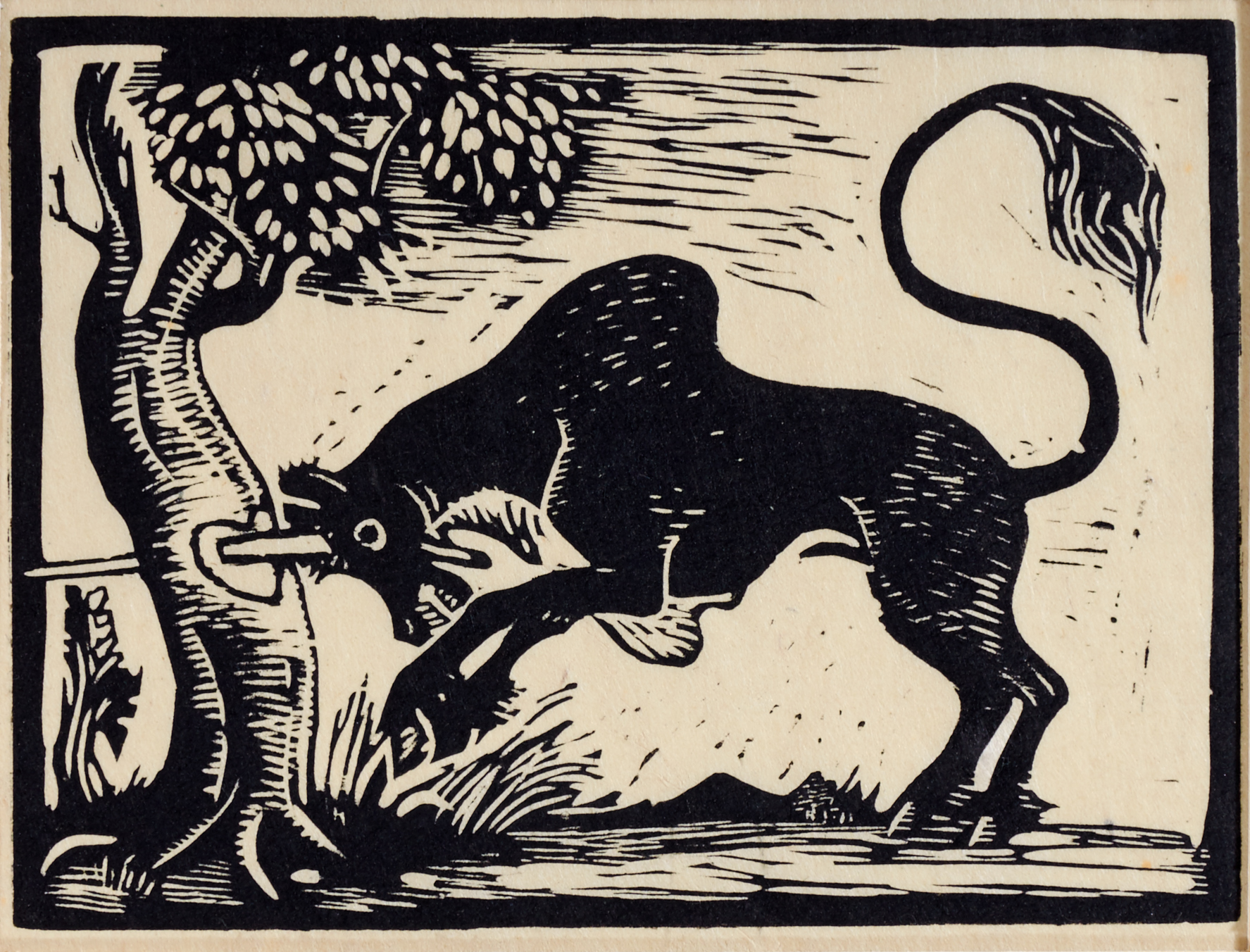 On devine au verso, en transparence, Renard invitant des poules et une oie à passer la soirée chez lui; ça va sans doute mal finir.