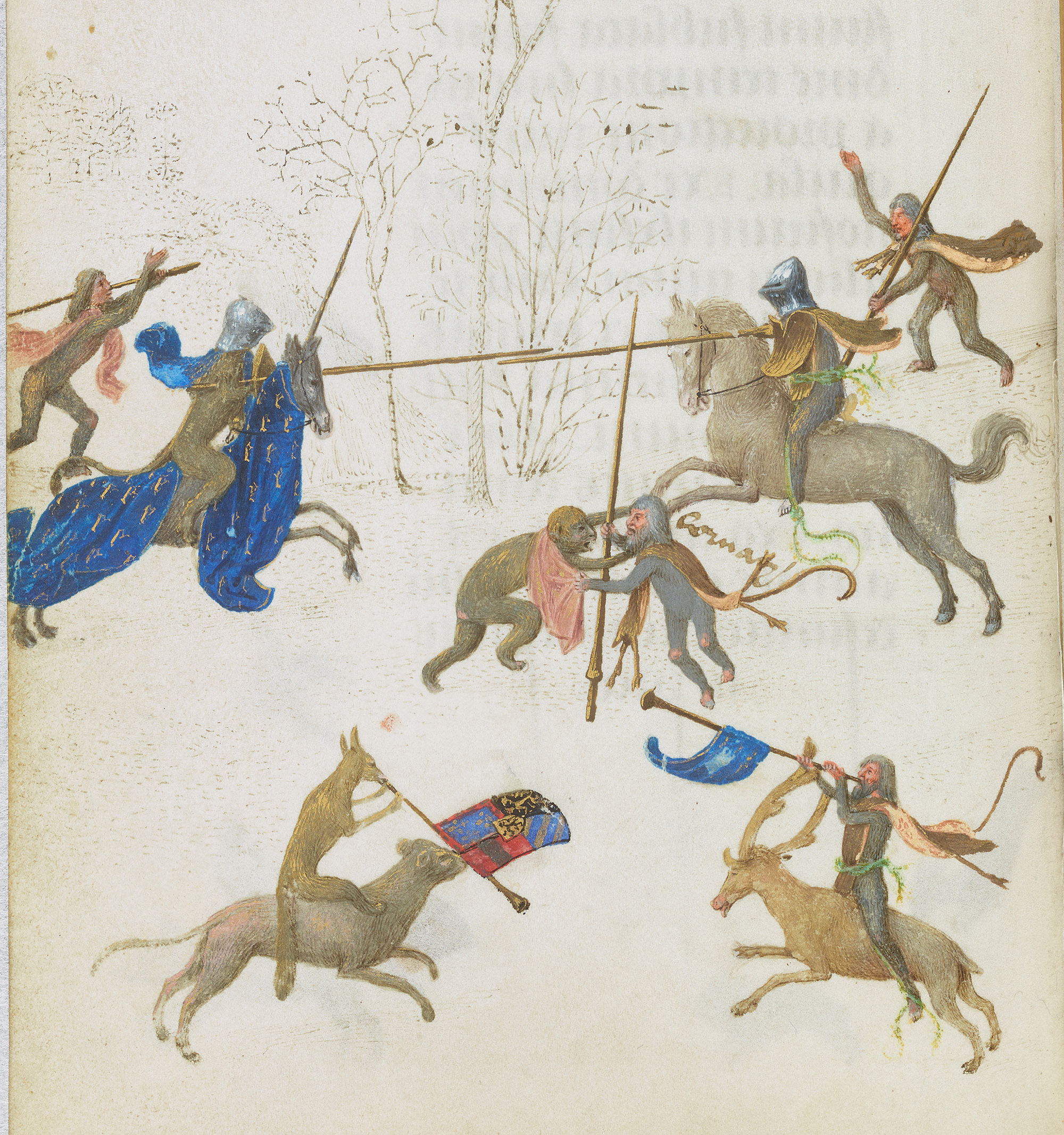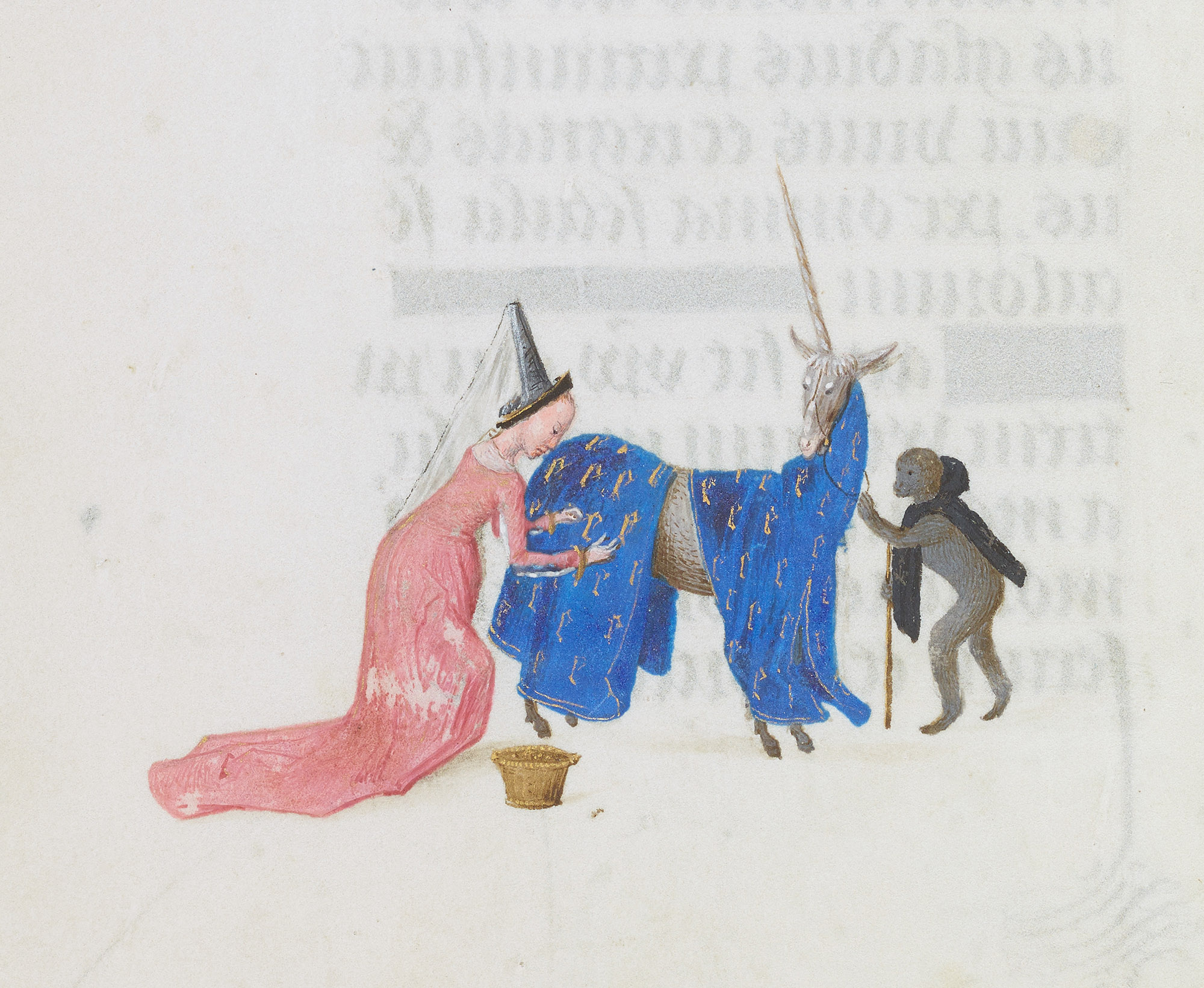 Ces licornes grises sont des bêtes sauvages, rapides, parfois agressives, qui courent dans les marges tantôt poursuivant un cerf ou un lapin, tantôt traquées par des chiens. Leurs relations avec d’autres animaux, les lions et surtout les singes, sont plus amicales. Les singes, comme souvent dans les enluminures médiévales, sont comme des hommes auxquels manqueraient la grâce divine, joueurs toujours, parfois violents ou obscènes. Lorsqu’ils côtoient les licornes, leurs jeux peuvent prendre un tour assez ambigu.